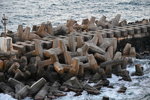 I am always fascinated by the man-made sea walls we see while cruising. This one shows a good example of the type of materials used to form the barriers, in this case a tetrapod.